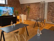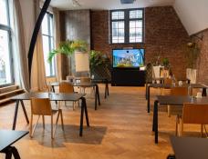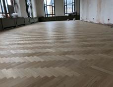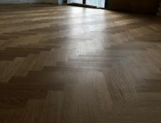 Massief eiken visgraat (klein model) met randstrook in halfsteensverband + eiken traptreden